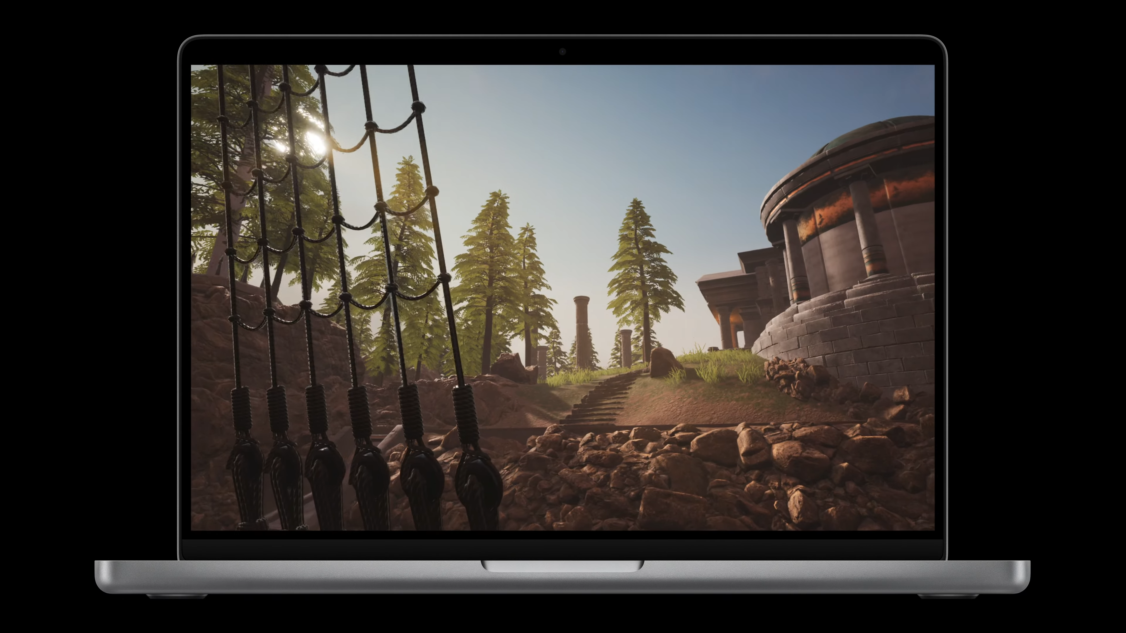 SurgicalAR을 통해 대용량 의학 이미지를 보고 움직일 때 XDR 디스플레이로 놀라운 디테일을 볼 수 있게 됩니다. 하드웨어 가속형 레이 트레이싱은 Myst 같은 게임에서 사실감 넘치는 빛과 그림자 반사 효과를 즐길 수 있도록 해줍니다.